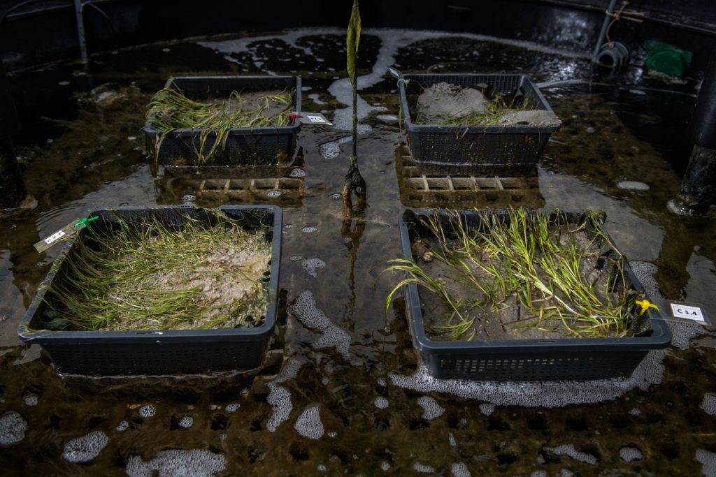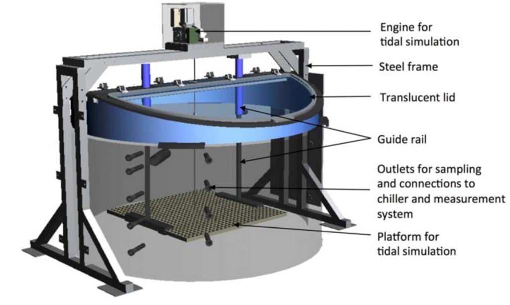 The AWI Sylt Outdoor Mesocosm facility (AWISOM) consists of 24 mesocosms, each with 1800 l sea water volume and a translucent cover. Each mesocosm can simulate tidal cycles and currents, and contain multi- parameter measurement systems to monitor multi-factorial climate change scenarios including warming, acidification, nutrient enrichment, and sea level rise. A multiparameter probe automatically records pH, salinity, oxygen content and temperature. The mesocosms are operated seasonally from April to October to study the influences of simulated environmental changes on species communities of the Wadden Sea.